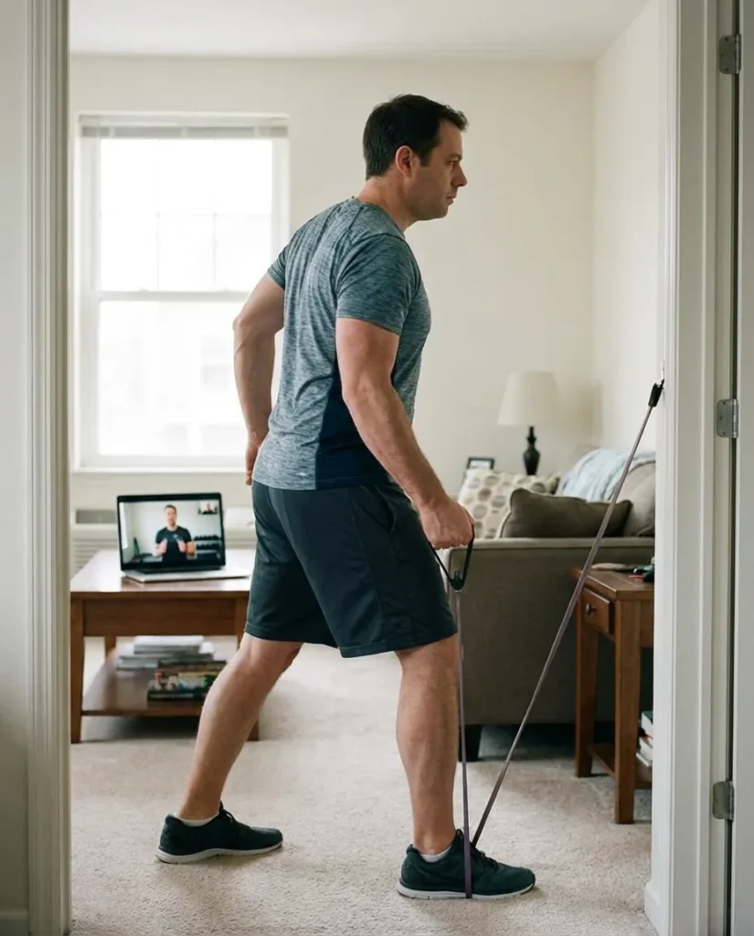 Dobieramy bezpieczne ćwiczenia i dbamy o technikę. Jeśli trzeba — konsultujesz się z lekarzem/fizjo.